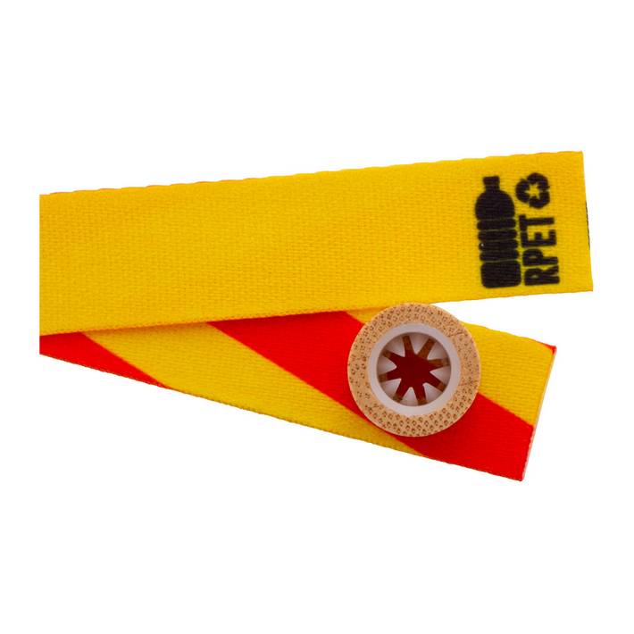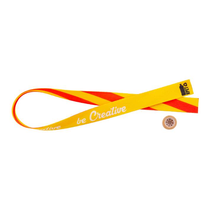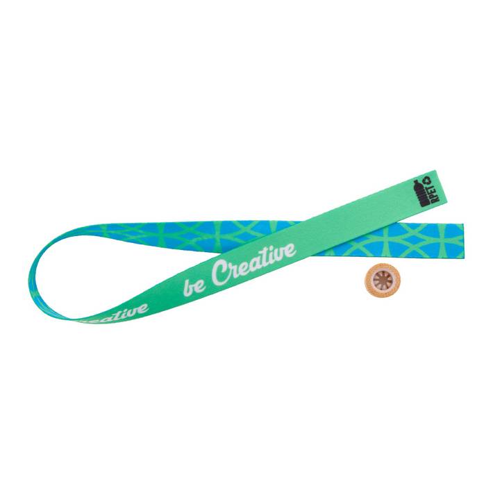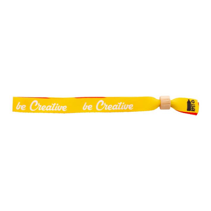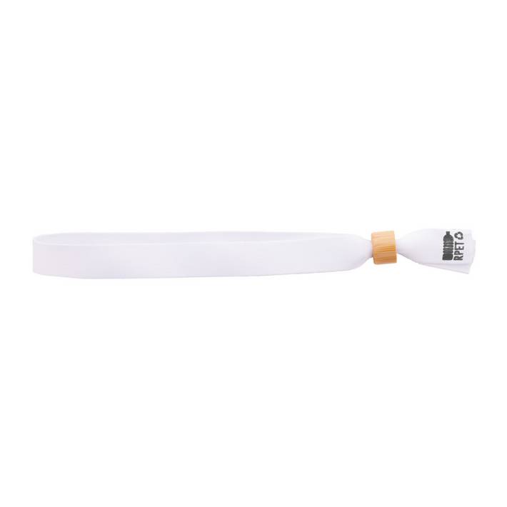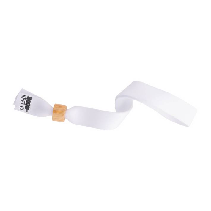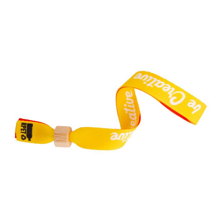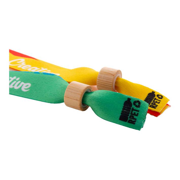 Braccialetto in poliestere RPET con chiusura di sicurezza in bambù. Personalizzabile con grafica stampata in sublimazione su entrambi i lati. Quantità minima: 100 pezzi.Quantità minima