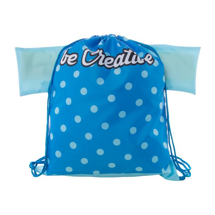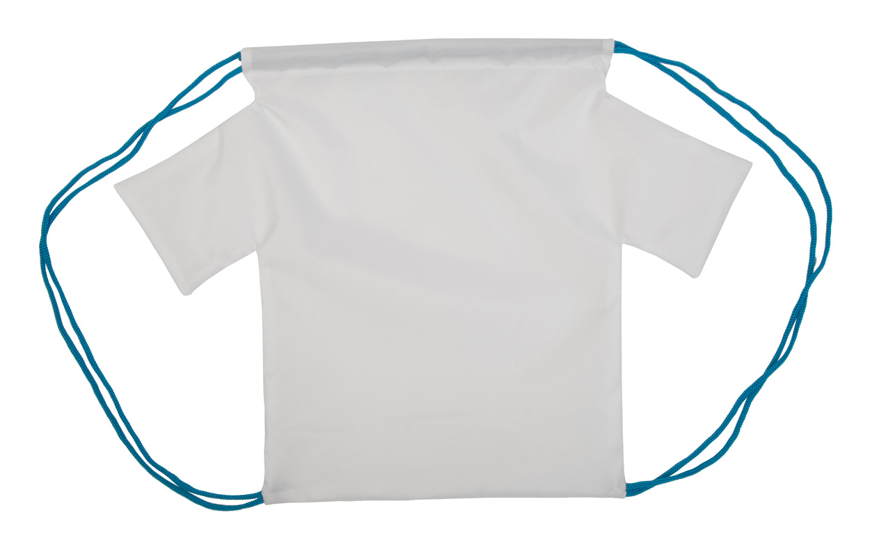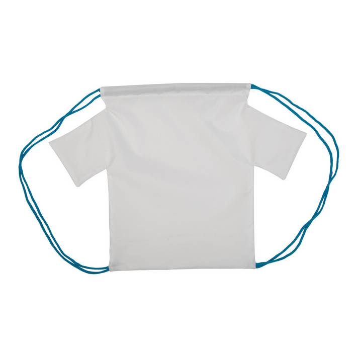 Sacca in poliestere 190T a forma di maglietta personalizzabile, con chiusura a coulisse, cordoncini colorati e grafica stampata in sublimazione su tutta la superficie. MOQ: 50 pezzi.Quantità minima