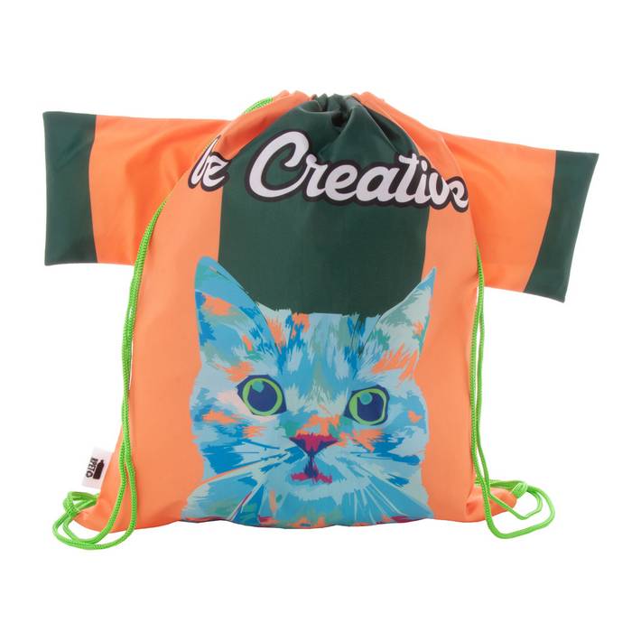 Sacca in poliestere 190T RPET a forma di maglietta personalizzabile, con chiusura a coulisse, cordoncini colorati e grafica stampata in sublimazione su tutta la superficie. MOQ: 50 pezzi.Quantità minima