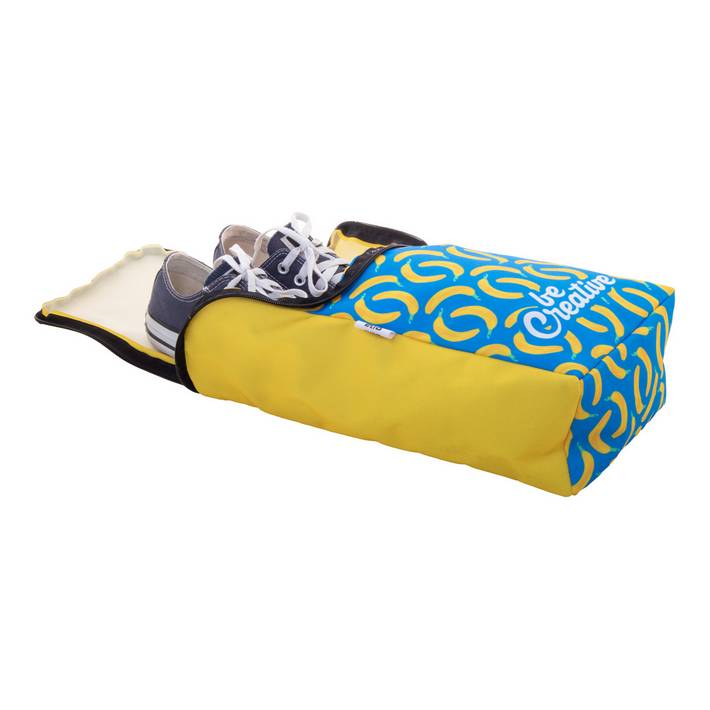 Custom made, zipped shoe bag in 600D RPET polyester with carry handle. With all-over sublimation printed graphics and distinctive RPET label. MOQ: 50 pcs.Quantità minima