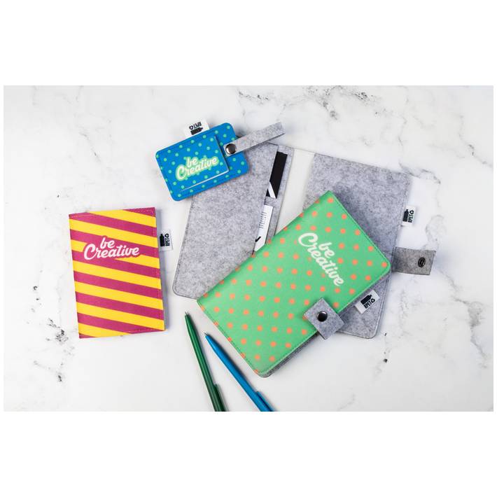 Custom made, RPET felt passport case with full colour printed cover and press-stud closure. With distinctive RPET label. Price includes sublimation printing. MOQ: 50 pcs.Quantità minima