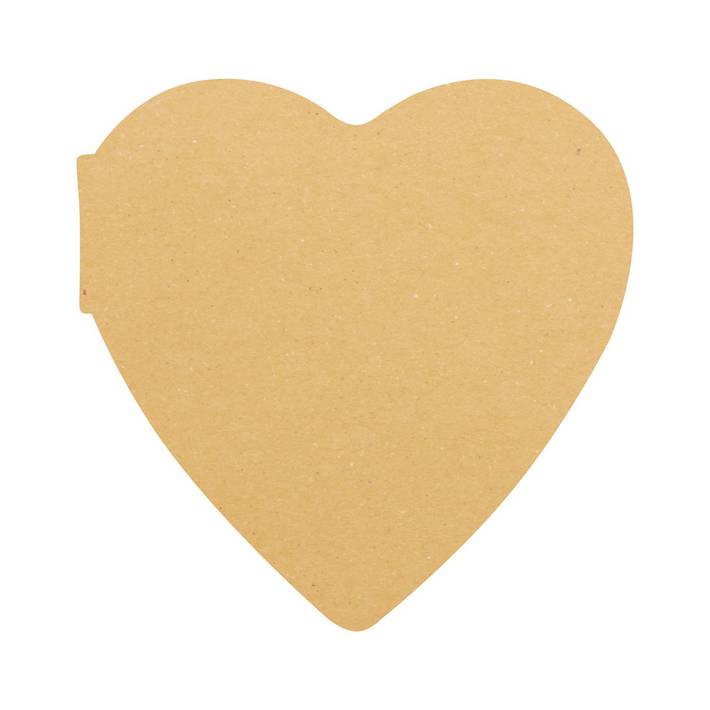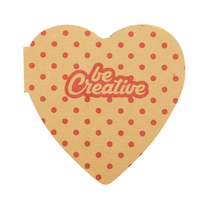 Custom made, recycled kraft paper covered heart shaped sticky notepad. Includes 50 sheets of recycled paper sticky notes. Price includes full colour printed outside cover. MOQ: 100 pcs.Quantità minima