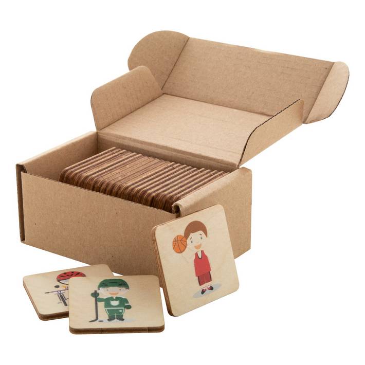 Gioco di memoria in legno di betulla laminato con motivi tematici. Con 24 tessere (40x40 mm). Il prezzo include 1 stampa a colori del logo sul retro di tutte le tessere. MOQ: 50 pz.Quantità minima