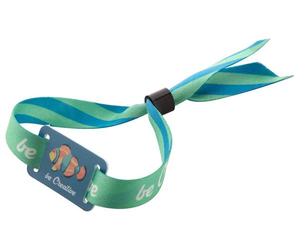 Braccialetto da festival in poliestere su misura con chiusura di sicurezza in plastica e placca in plastica stampata a colori. Con grafica a sublimazione stampata su entrambi i lati. Quantità minima: 100 pezzi.Quantità minima