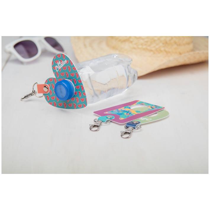 Reggi bottiglie di plastica PET con moschettone. Il prezzo include la stampa full color. Quantità minima: 100 pezzi.