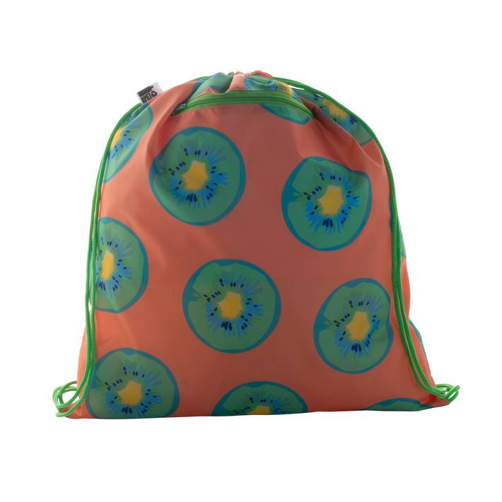 Sacca personalizzabile in poliestere 190T RPET con coulisse e tasca frontale provvista di cerniera. Con grafica stampata in sublimazione su tutta la superficie. MOQ: 50 pz.Quantità minima