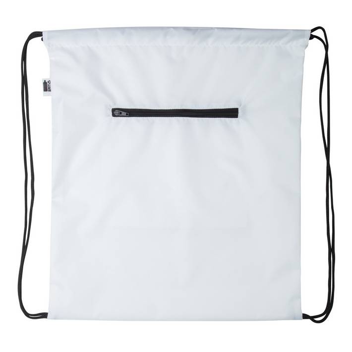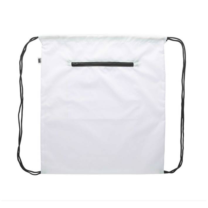 Sacca personalizzabile in poliestere 190T RPET con coulisse e tasca frontale provvista di cerniera. Con grafica stampata in sublimazione su tutta la superficie. MOQ: 50 pz.Quantità minima