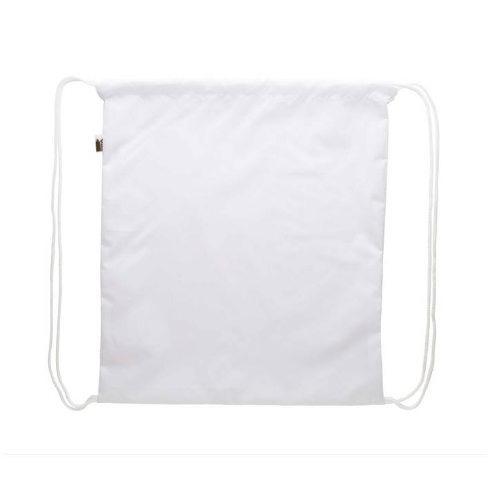 Custom made drawstring bag with coloured strings, 190T RPET polyester. With all over sublimation printed graphics and distinctive RPET label. MOQ: 50 pcs.Quantità minima