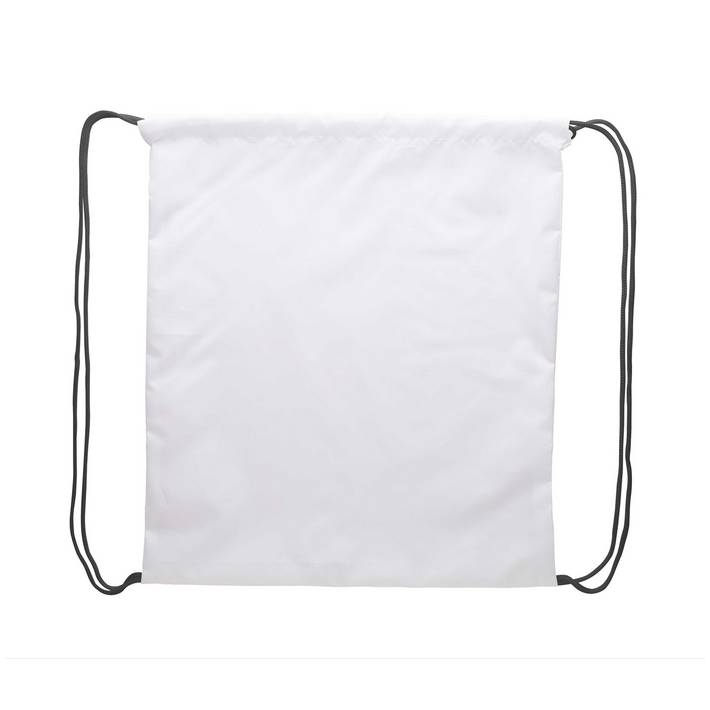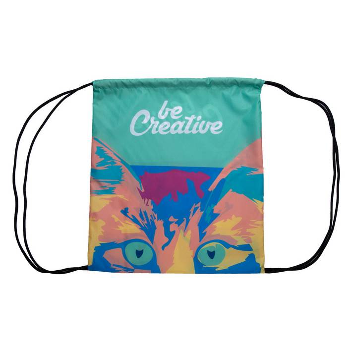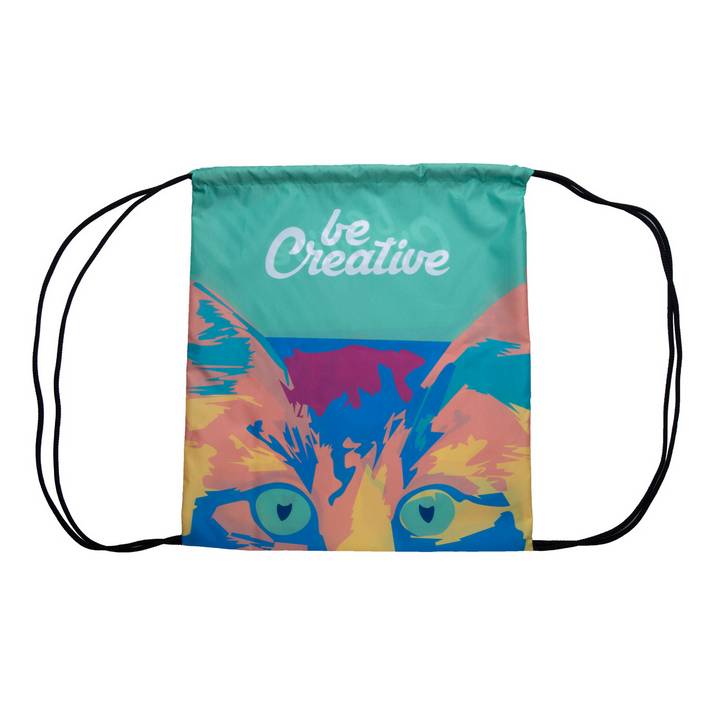 Sacca personalizzabile con chiusura a coulisse e cordoncini colorati, in poliestere 190T. Grafica stampata in sublimazione su tutta la superfice. MOQ: 50 pezzi.Quantità minima