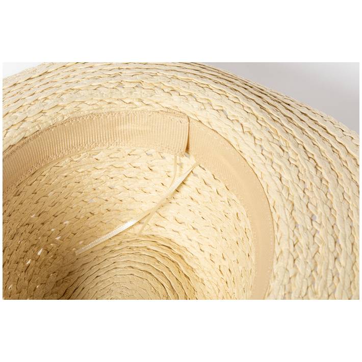 Cappello unisex in fibra di paglia sintetica e fascia interna regolabile.