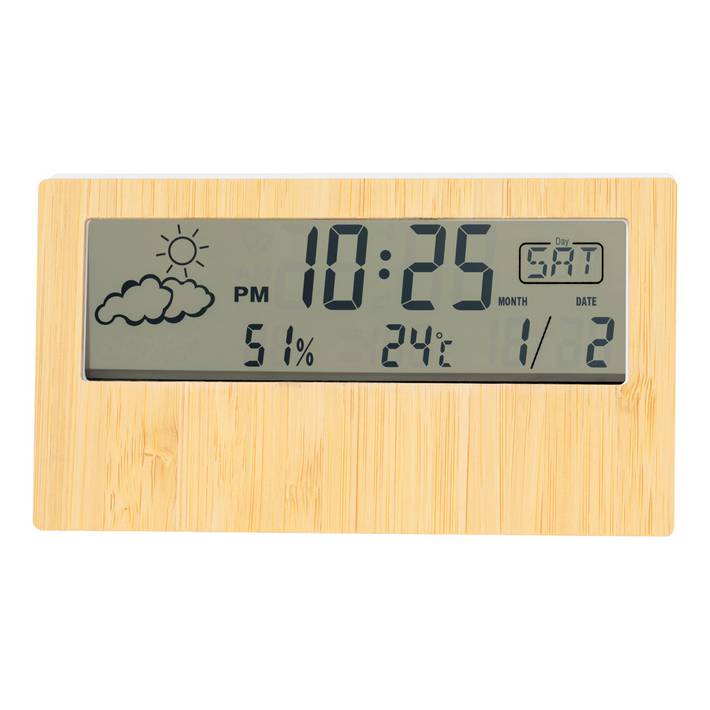 Orologio digitale e stazione meteorologica in bambù e plastica ABS, con termometro ed igrometro. Funziona con 2 batterie AAA, non fornite.Quantità minima