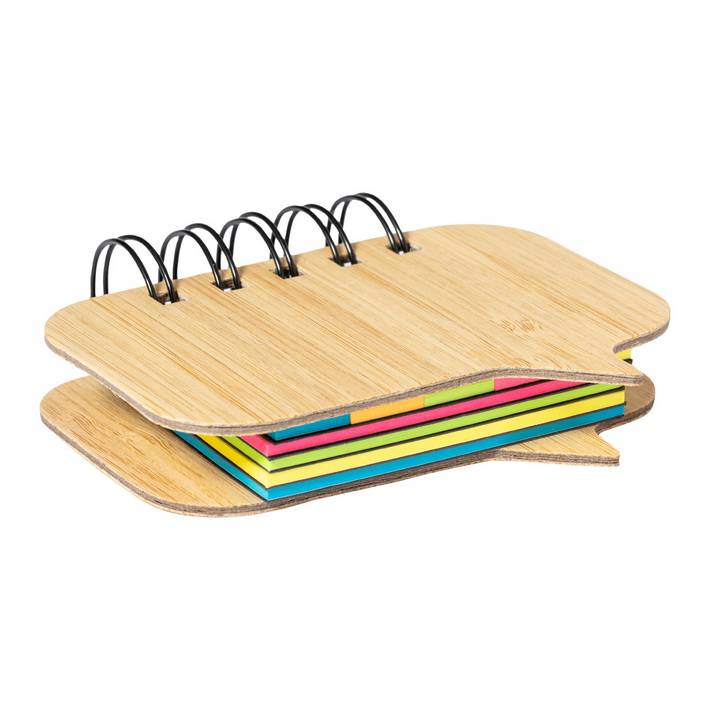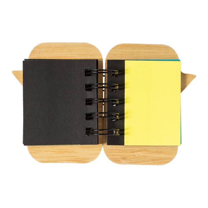Bamboo covered, spiral notepad with 100 large sticky notes (in 4 different colours) and 125 page markers (in 5 different colours).Quantità minima