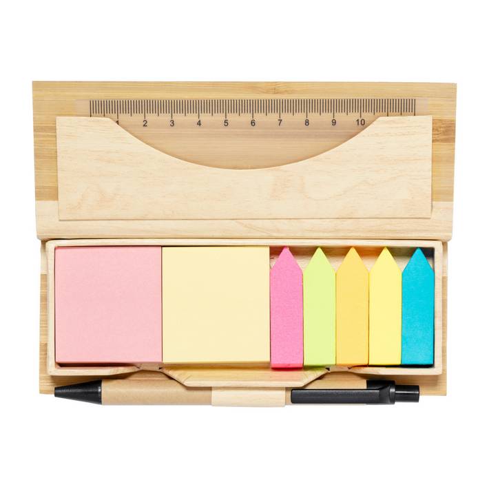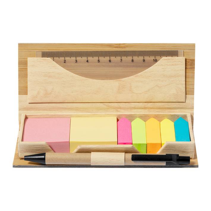 Sticky notepad with 220 sticky notes (in 2 different colours) and 550 page markers (in 5 different colours) in bamboo case. Including a 12 cm ruler and a recycled cardboard pen with blue refill.Quantità minima