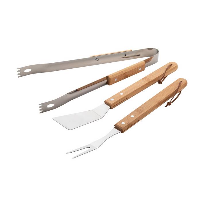 Set barbecue in acciaio inossidabile da 3 pezzi con manico in bambù (forchetta, pinza e paletta) in scatola di cartoncino kraft.