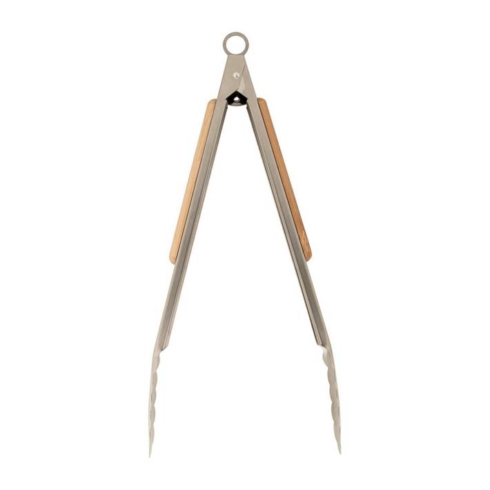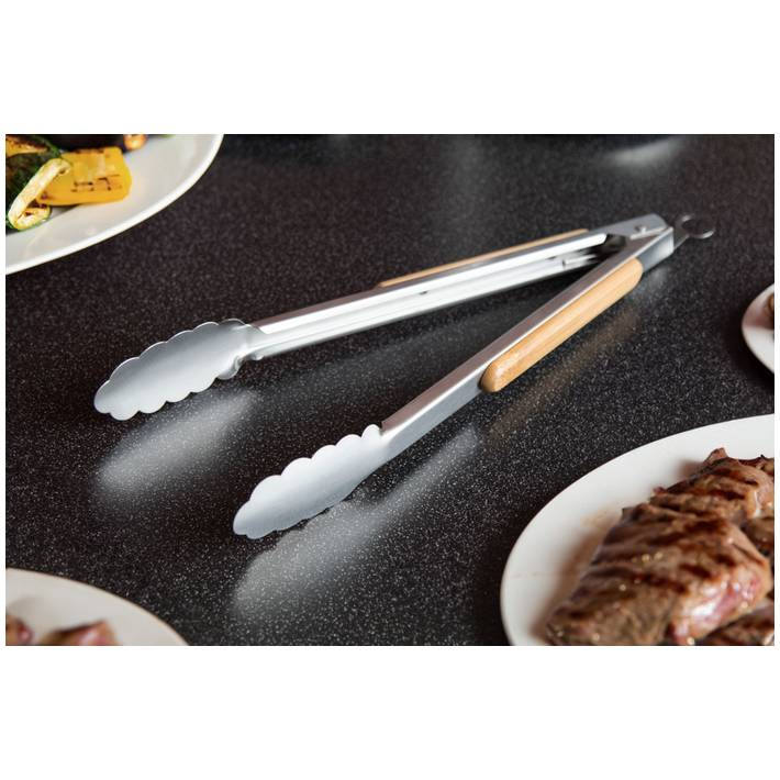 Pinza per barbecue in acciaio inossidabile con manici in bambù e meccanismo di bloccaggio.