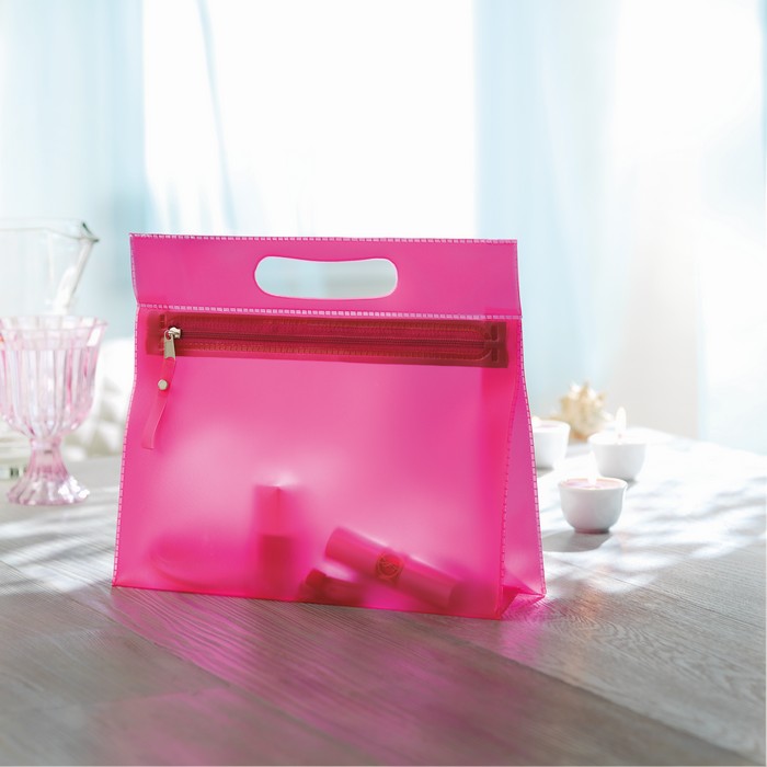 Portatrucchi in PVC con chiusura a zip e manico.