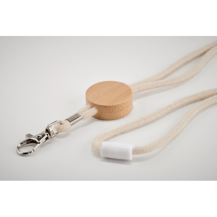 Cordoncino in cotone con dettaglio in bamboo rotondo, gancio in metallo e chiusura di sicurezza. Lunghezza: 50 cm. Il bamboo è un materiale naturale e può avere delle variazioni leggere di colore, dimensione e stampa.Quantità minima