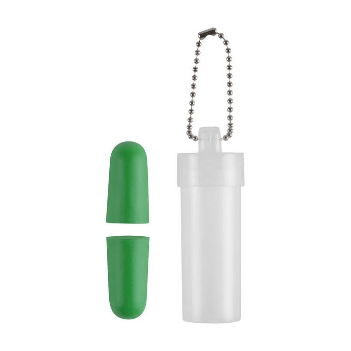 Tappi per orecchie colorati in EVA in custodia di plastica trasparente con catena in metallo.