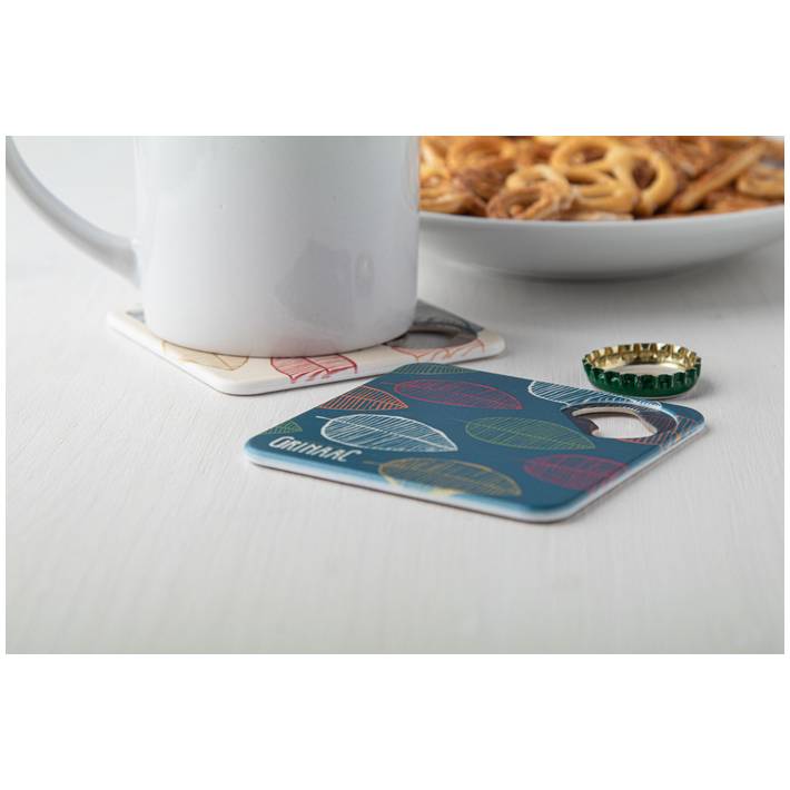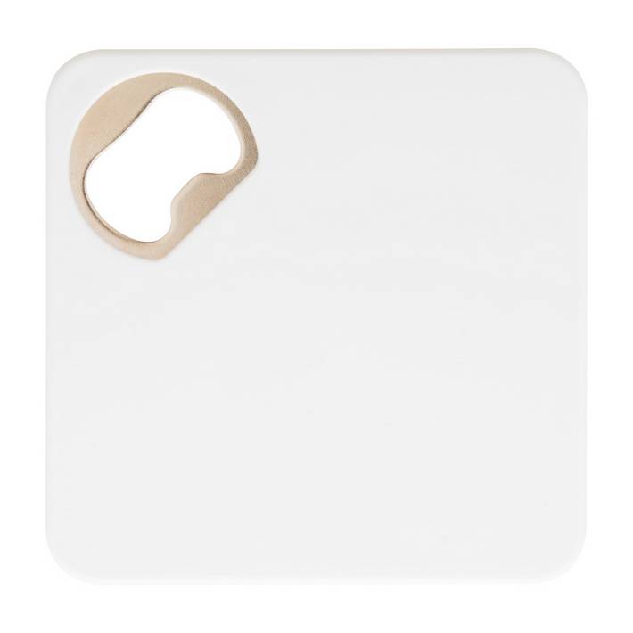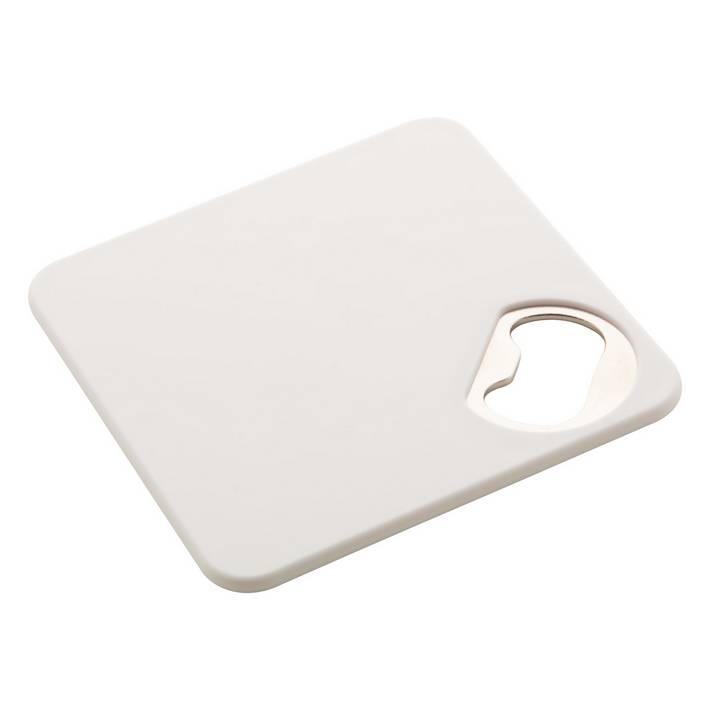 Sottobicchiere in plastica con apribottiglie in metallo e fondo antiscivolo.