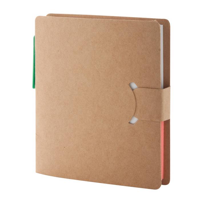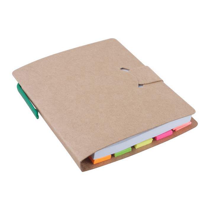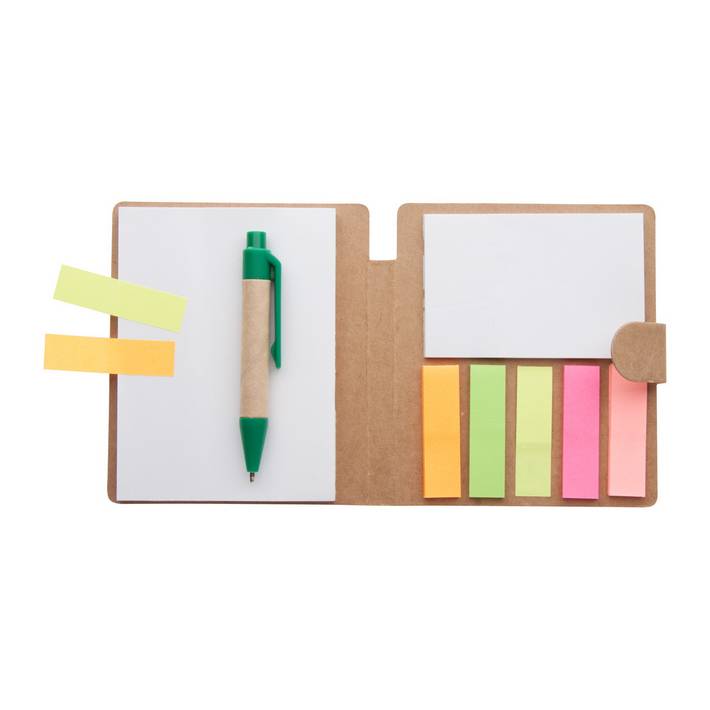 225 note adesive di varie dimensioni, con una penna a sfera in confezione di cartone.