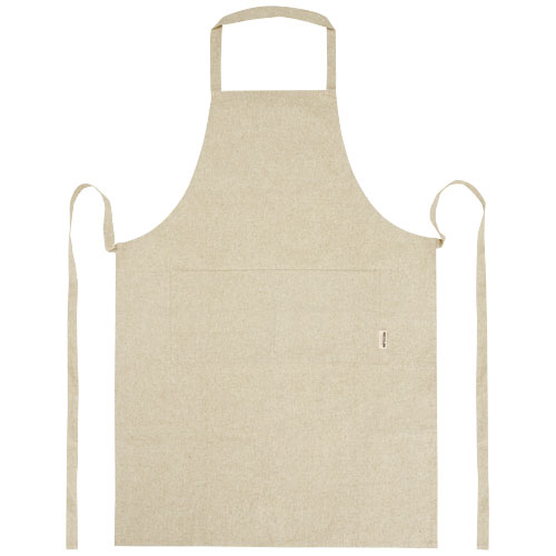 Predpasnik iz 200g/m2 mešanice recikliranega bombaža in poliestra. Spredaj ima dva žepa, zadaj dva trakova za prilagoditev velikosti. Dolžina vratnega traku je 55cm. Ker je predpasnik iz recikliranega materiala, odtenki lahko varirajo.Minimalna količina: