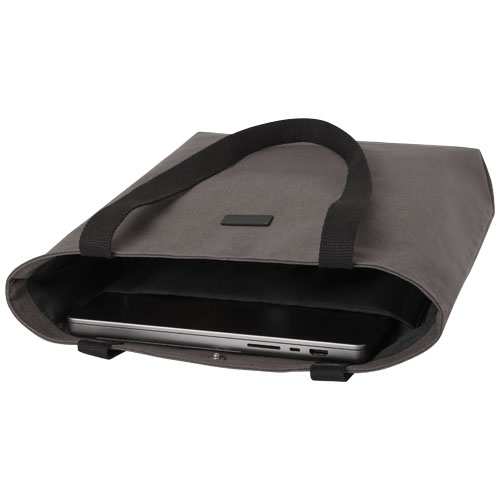 Tote bag made of GRS certified recycled canvas and GRS certified RPET lining. This versatile tote bag features a padded 15" laptop compartment and two sleeve pockets inside for a phone, wallet or accessories, and an easy button closure to the opening and comfortable cotton webbing handles. The decorative metal plate can make a logo shine through its subtle and matt finish.Minimalna količina:
