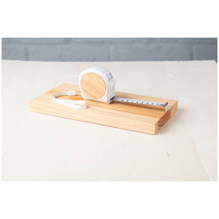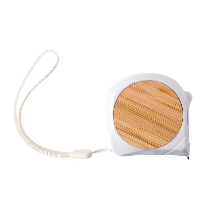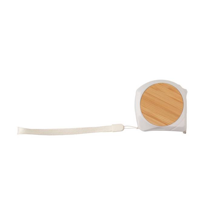 Plastic and bamboo tape measure with lock function, metal clip and hand strap, 5 m.