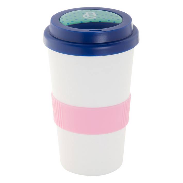 Customisable, double-wall plastic thermo mug with drinking lid and silicone grip. 400 ml. MOQ: 50 pcs.