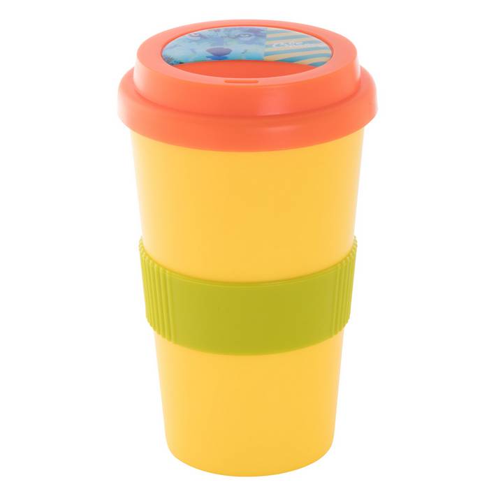 Customisable, double-wall plastic thermo mug with drinking lid and silicone grip. 400 ml. MOQ: 50 pcs.