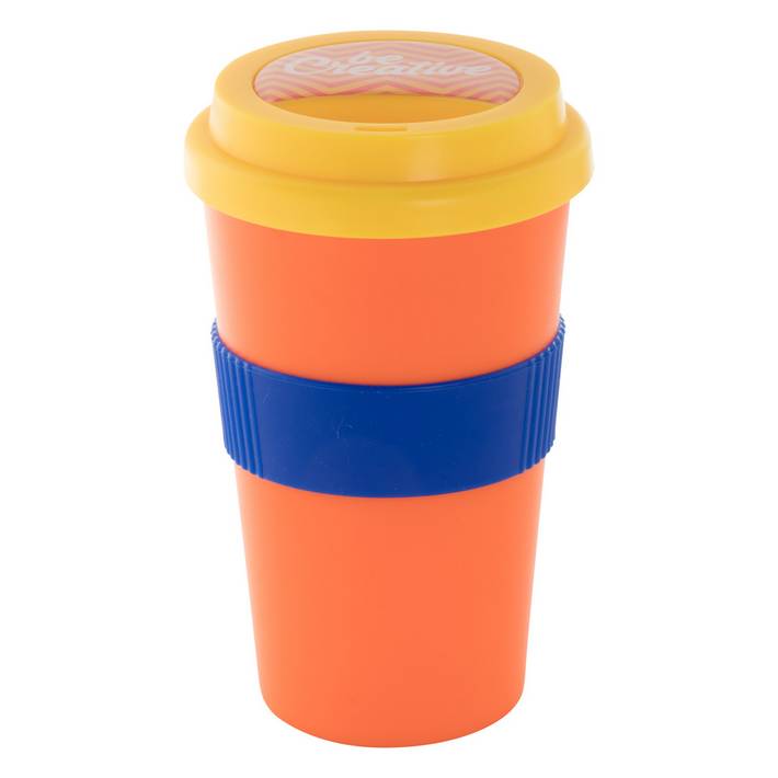 Customisable, double-wall plastic thermo mug with drinking lid and silicone grip. 400 ml. MOQ: 50 pcs.