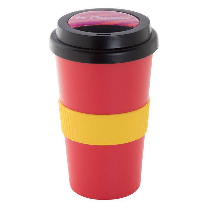 Customisable, double-wall plastic thermo mug with drinking lid and silicone grip. 400 ml. MOQ: 50 pcs.