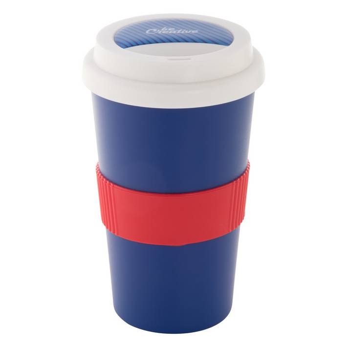 Customisable, double-wall plastic thermo mug with drinking lid and silicone grip. 400 ml. MOQ: 50 pcs.