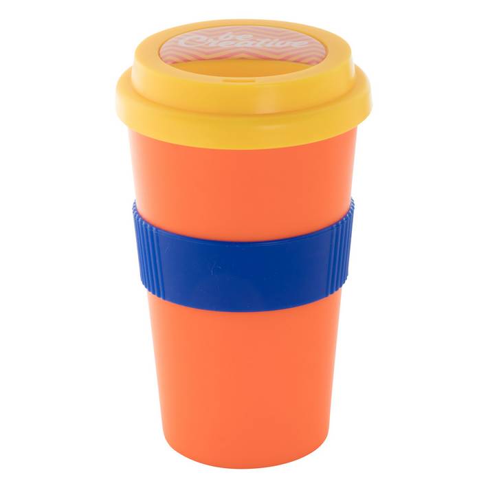 Customisable, double-wall plastic thermo mug with drinking lid and silicone grip. 400 ml. MOQ: 50 pcs.