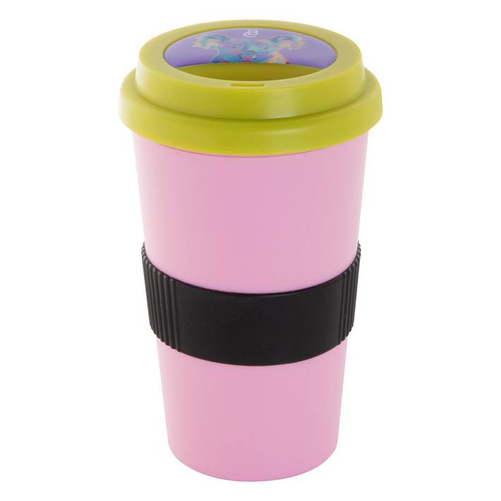Customisable, double-wall plastic thermo mug with drinking lid and silicone grip. 400 ml. MOQ: 50 pcs.