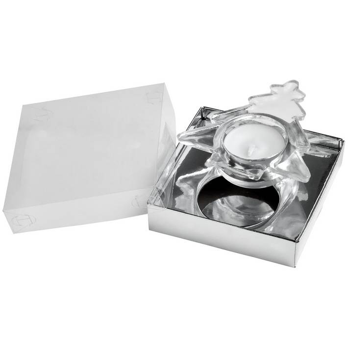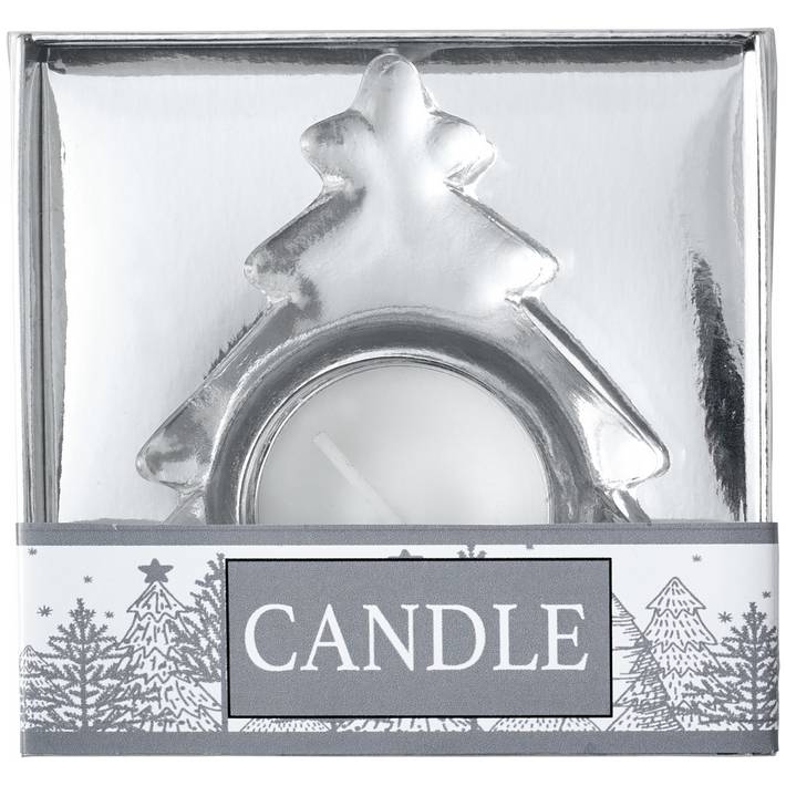 Glass holder in the shape of a Christmas tree, including tealight. Presented in a gift box.