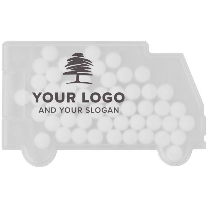Bombončki mint v škatlici z obliko tovornjaka. Približno 5,5 g, brez sladkorja.