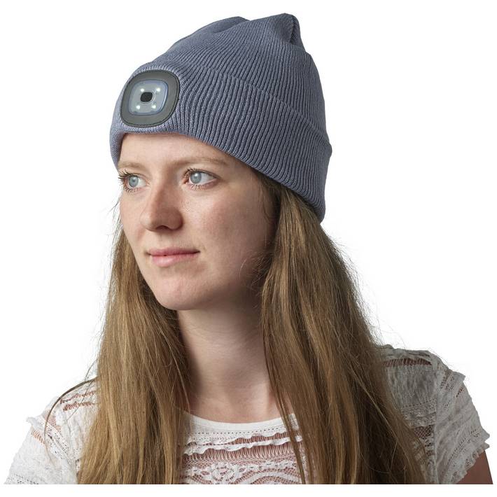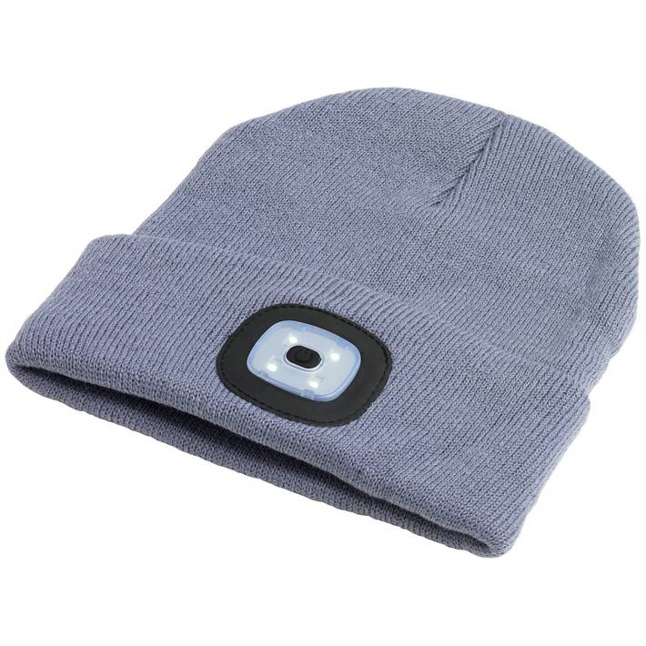 Acrylic beanie with a COB light with three brightness settings. Batteries included.