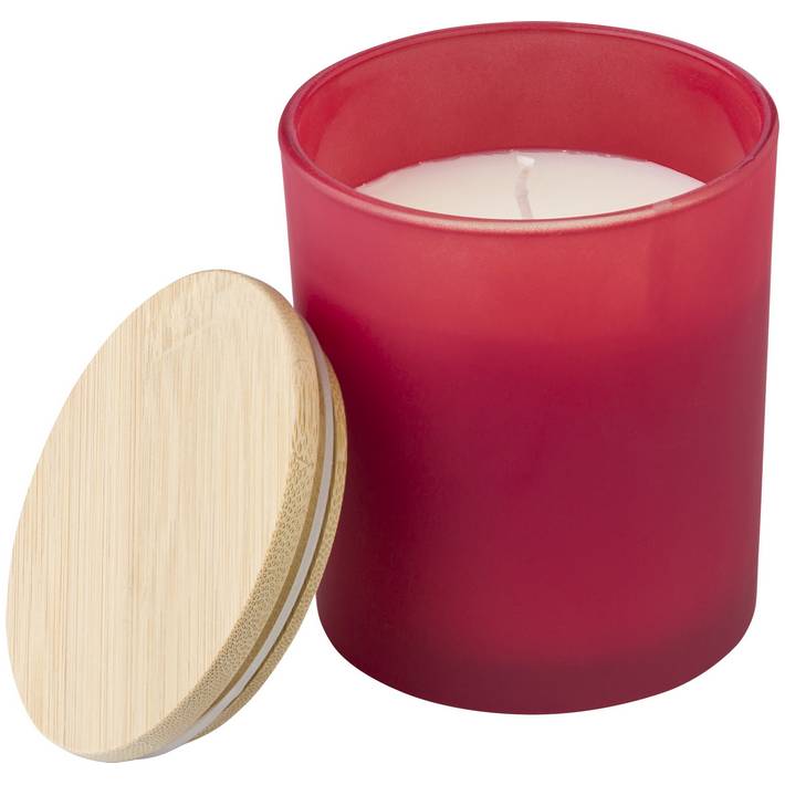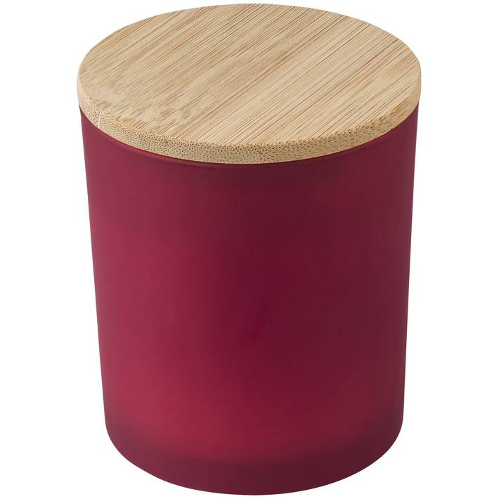 Glass candle with plant-based wax and a bamboo lid. The candle contains mainly plant-based wax (carnauba wax) and has a burning time of around 46 hours. Four scents depending on the glass colour: cinnamon (red), vanilla (white), sandalwood (black), and jasmine (green). Individually packed in a white tube.Minimalna količina: