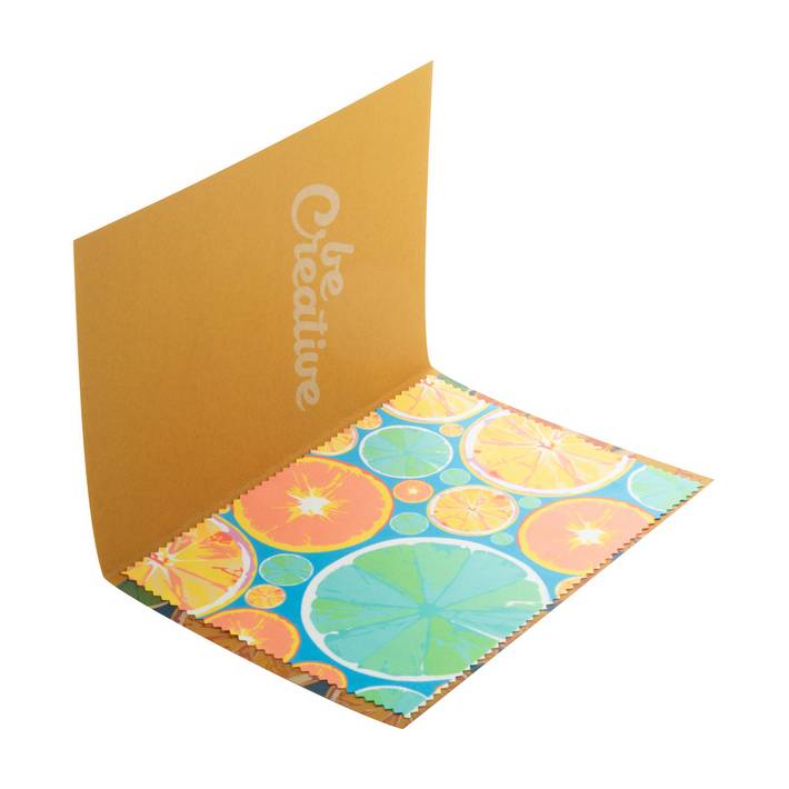 Custom made kraft paper postcard with custom graphic on both sides. Including a sublimation printed 100% RPET microfibre (170 g/m²) cleaning cloth for glasses. MOQ: 100 pcs.Minimalna količina: