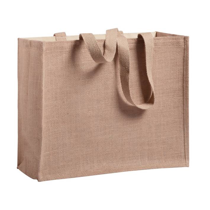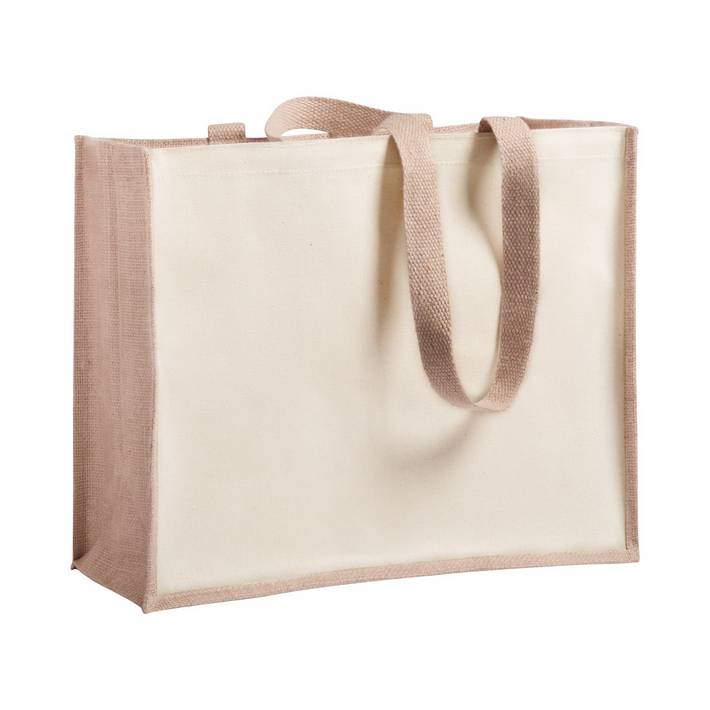 Shopping bag in combination of laminated jute and laminated cotton with long handles.