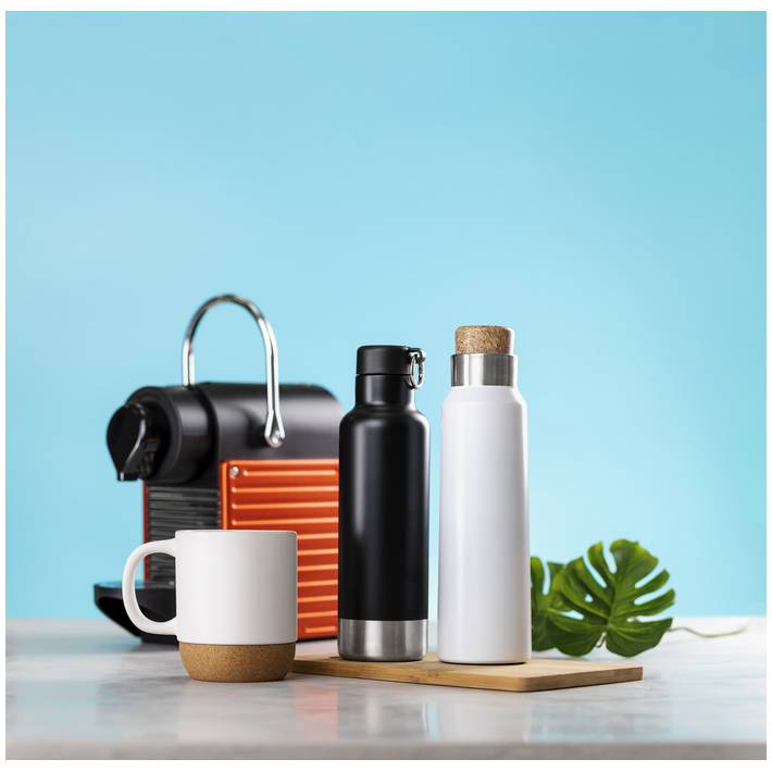 Stainless steel, single wall sport bottle with cork patterned cap, 770 ml. In kraft paper box. Not suitable for carbonated drinks.Minimalna količina: