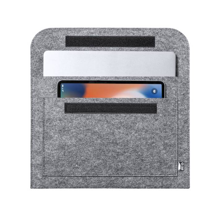RPET felt laptop pouch with front pocket and velcro closure. With distinctive RPET label.