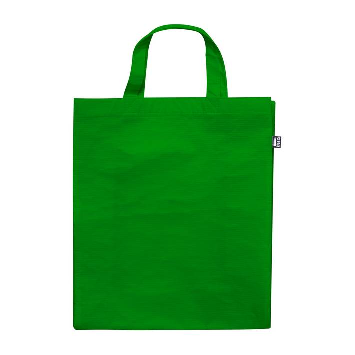 Laminated RPET polyester shopping bag with gusset and short handles, 110 g/m². With distinctive RPET label.