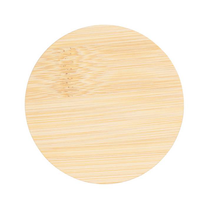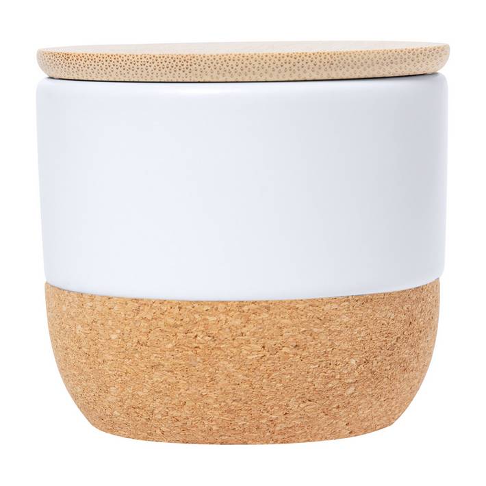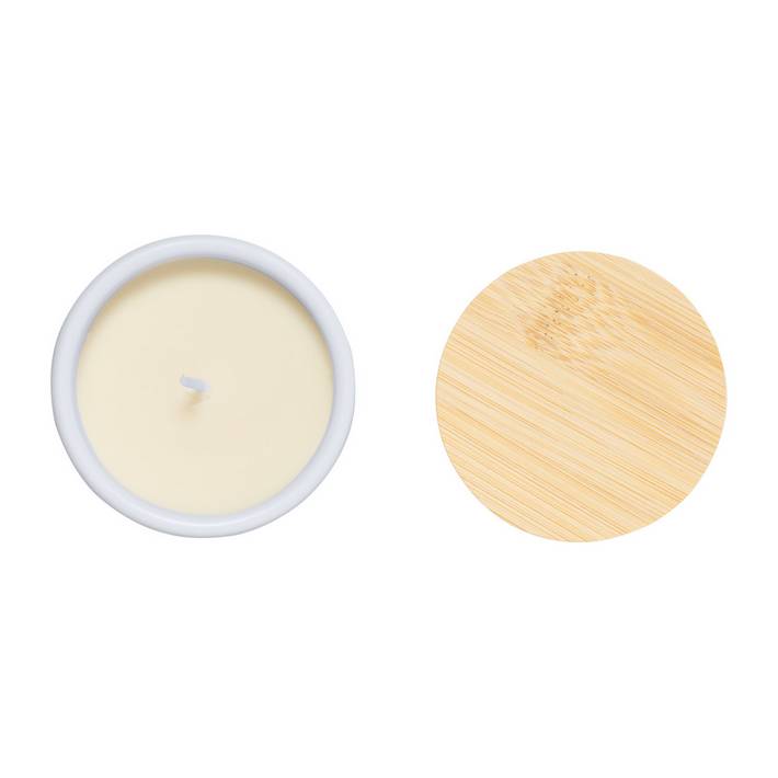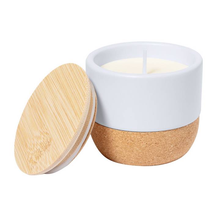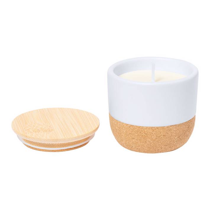 Vanilla scented plant-based wax candle in ceramic holder with natural cork bottom and bamboo lid.