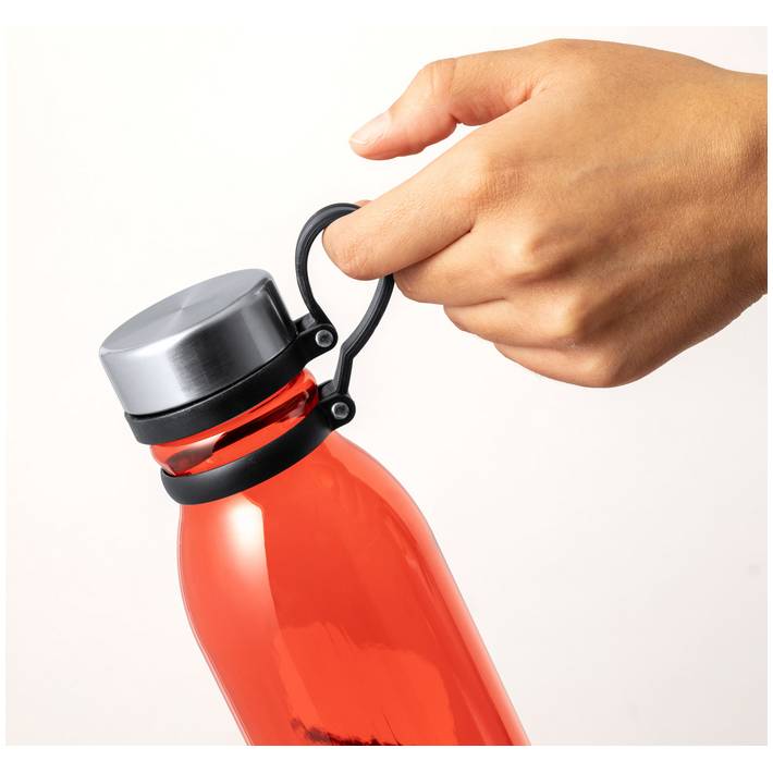RPET bottle with stainless steel carry lid, 830 ml. BPA-free. Not suitable for carbonated drinks.