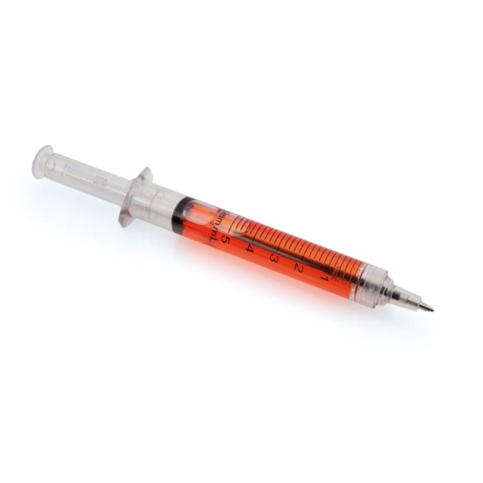 Syringe shaped plastic ballpoint pen with liquid filled transparent body. With blue refill.