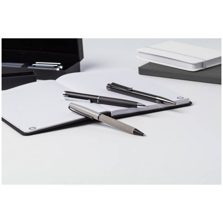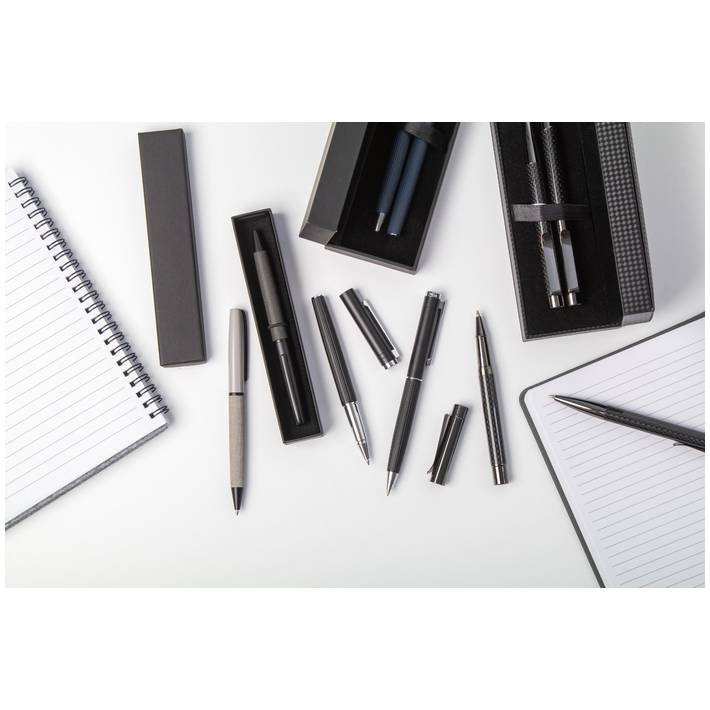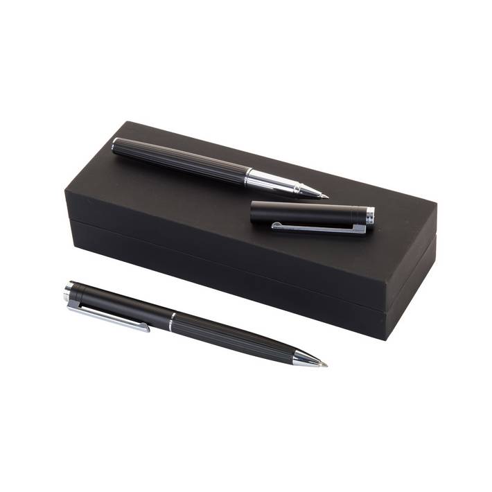 Elegant, aluminium ballpoint pen and roller pen set with stripe textured barrel. In black gift box, with blue refill.