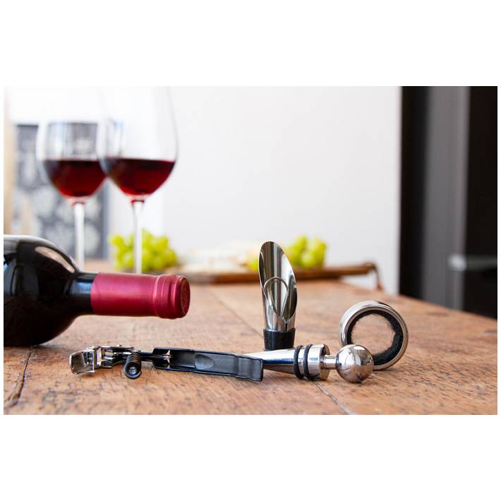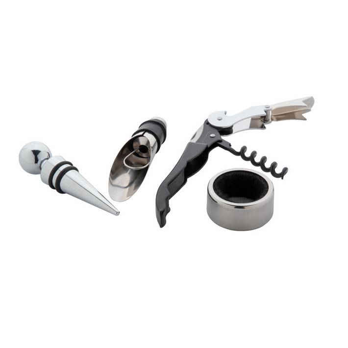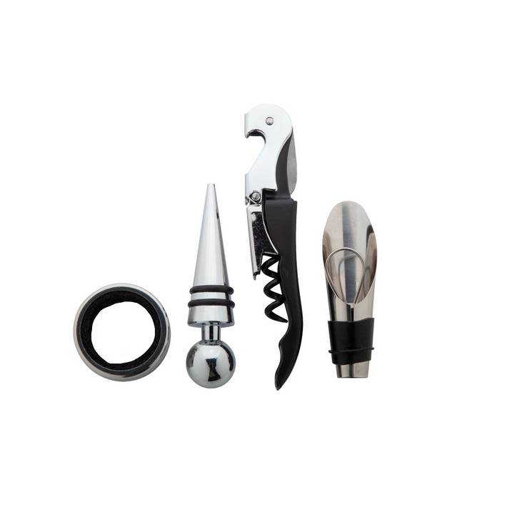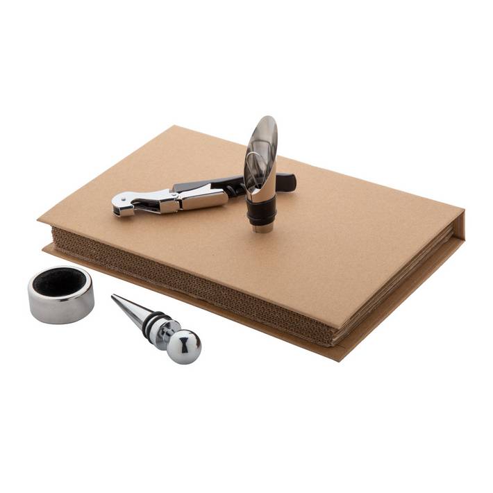 4 pc stainless steel wine set in recycled kraft paper book shape box. Including corkscrew, drop stopper, nozzle and plug.