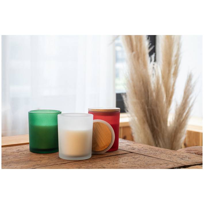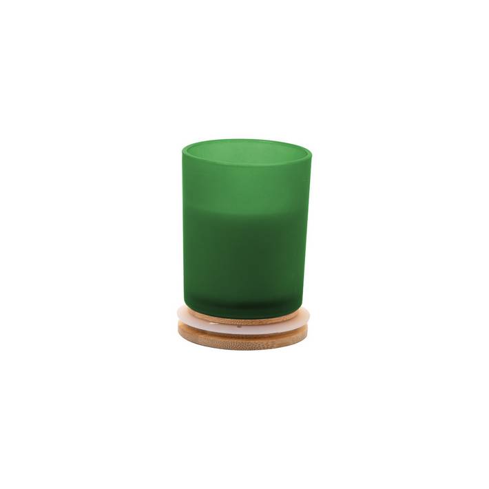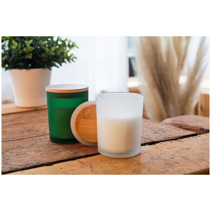 Scented plant-based wax candle in frosted glass holder with bamboo lid. With 120 grams of wax. In kraft paper box.