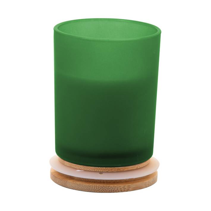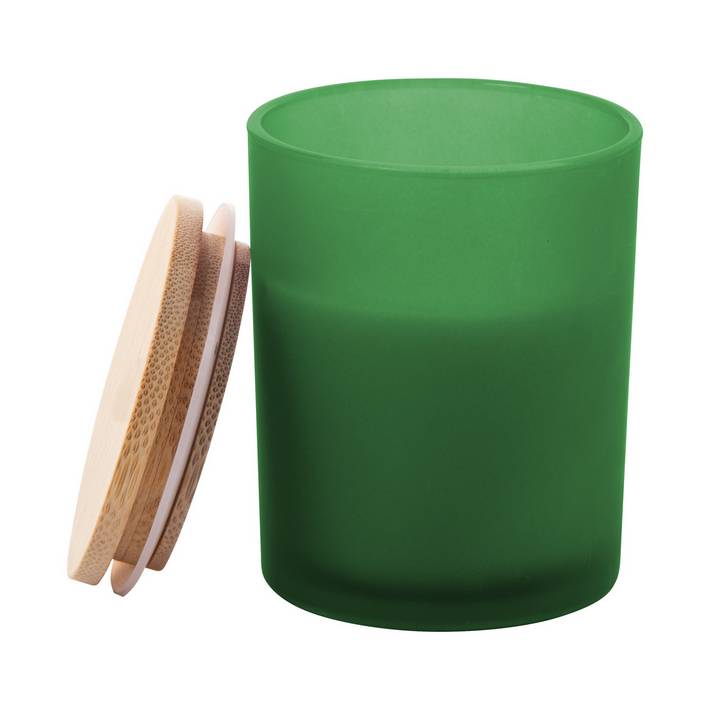 Scented plant-based wax candle in frosted glass holder with bamboo lid. With 200 grams of wax. In kraft paper box.